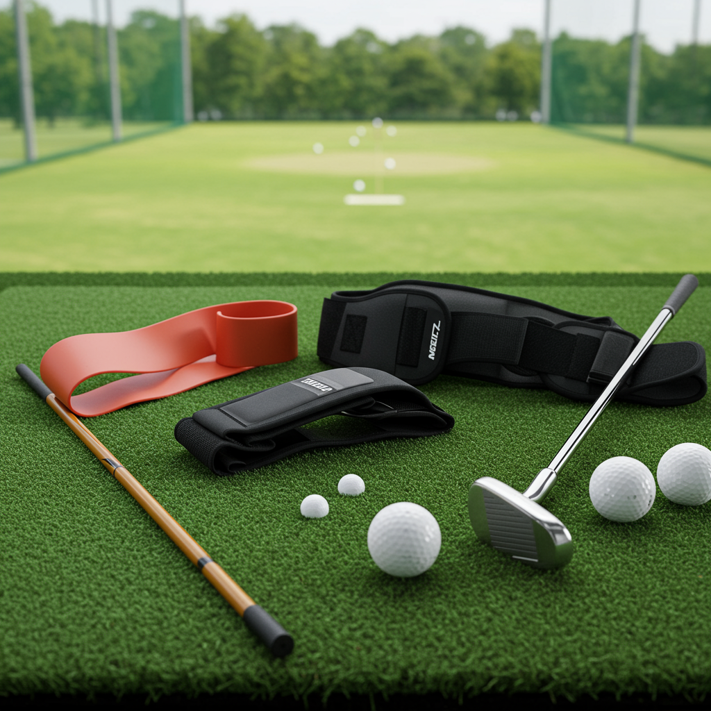 손목 각도를 고정하거나 팔의 위치를 잡아주는 형태의 자세 교정 스틱이나 밴드가 유용합니다. 클럽에 부착하여 손목 꺾임을 느끼게 하거나, 팔에 착용하여 올바른 간격을 유지하도록 돕는 도구들이 있습니다.
