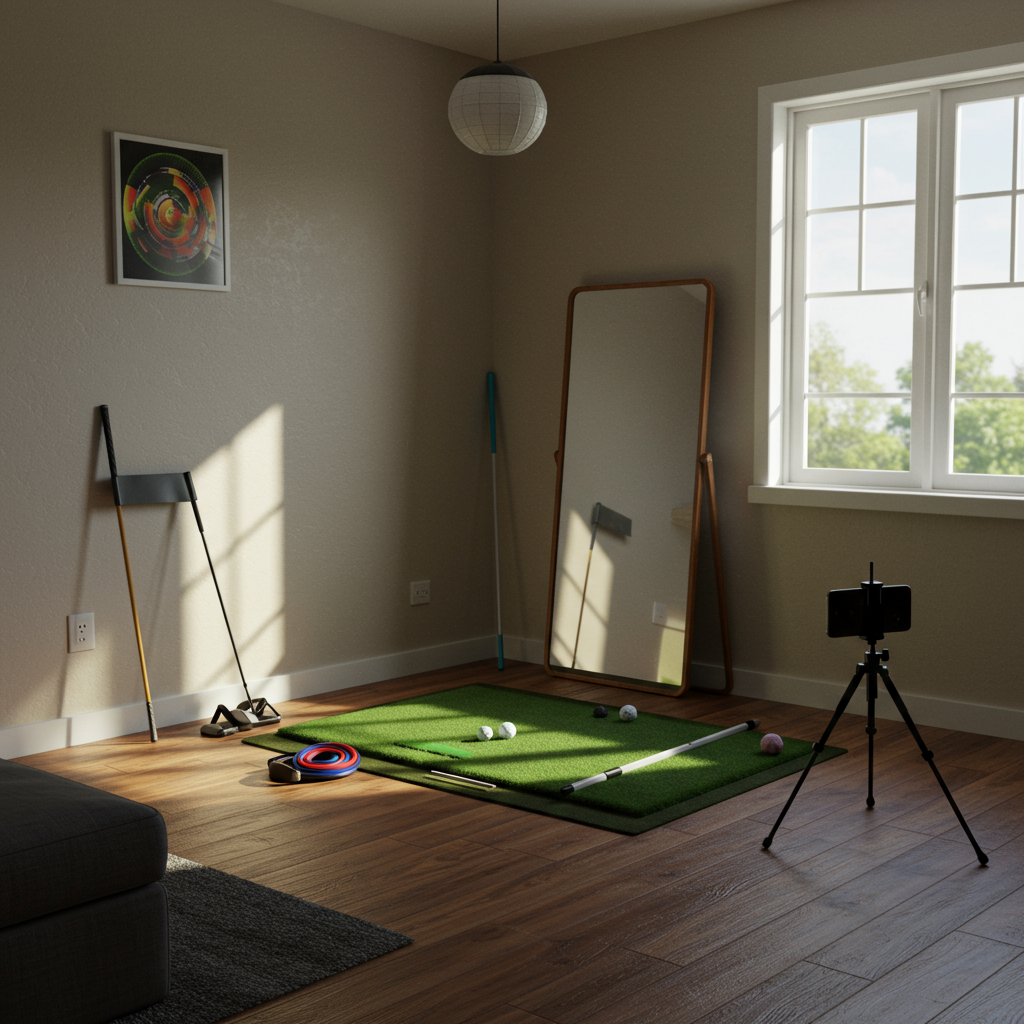실내에서 연습할 때는 클럽이 벽이나 가구에 부딪히지 않도록 충분한 공간을 확보하는 것이 가장 중요합니다. 특히 백스윙 탑과 팔로스루 공간을 확인하세요. 깨지기 쉬운 물건은 치우고, 바닥이 미끄럽지 않은지 확인합니다. 전신 거울이 있다면 스윙 자세를 확인하며 연습하기 좋습니다.